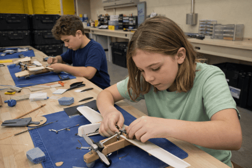 RC aircraft work begins with modelling and straight flight. Children assemble simple cardboard RC planes, focusing on structure, weight distribution and safe takeoff. Test flights concentrate on steady rise, straight glide and controlled landing.